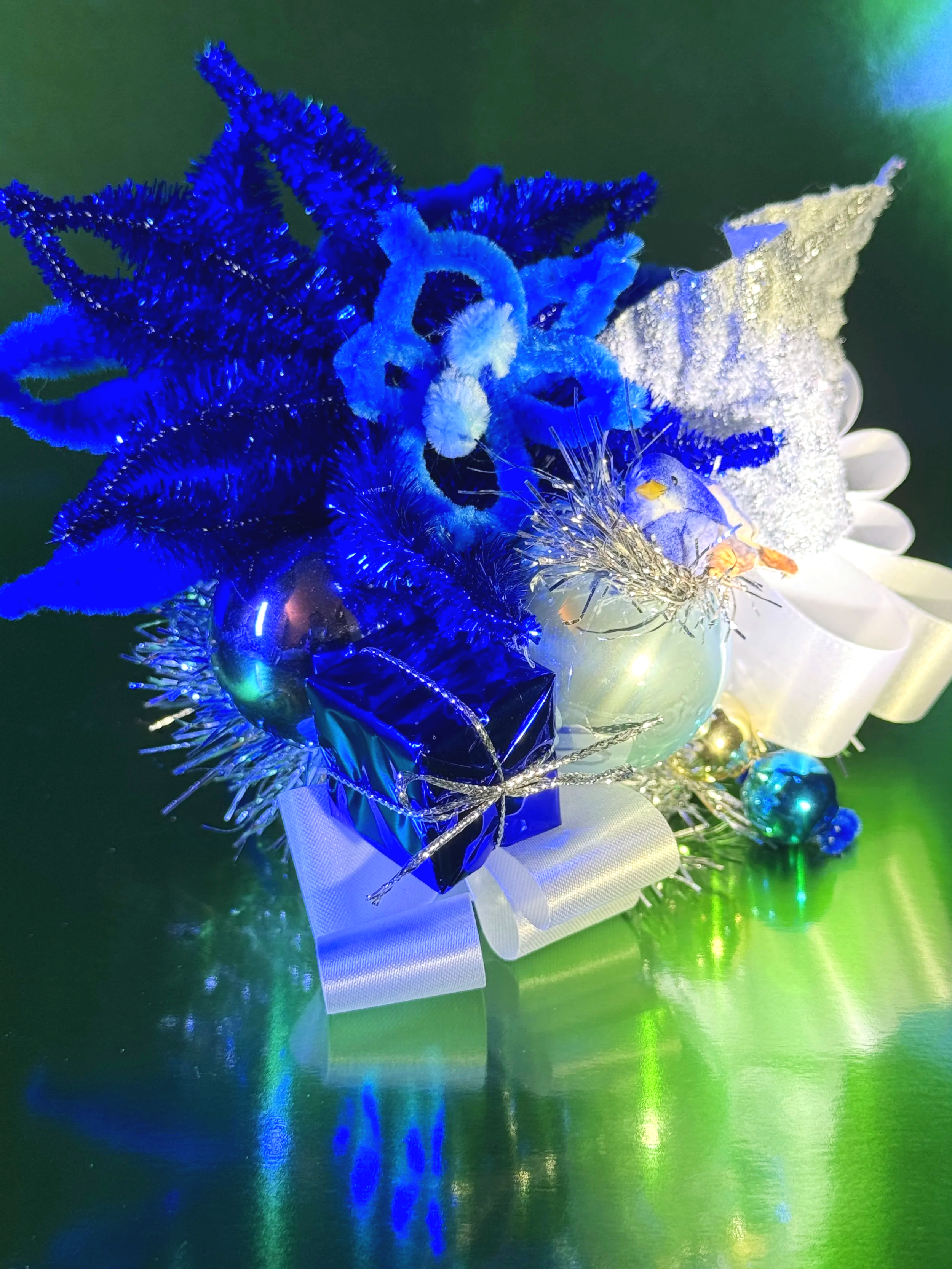 Deep cobalt tinsel forms a sculptural burst, layered with soft chenille loops and metallic accents.