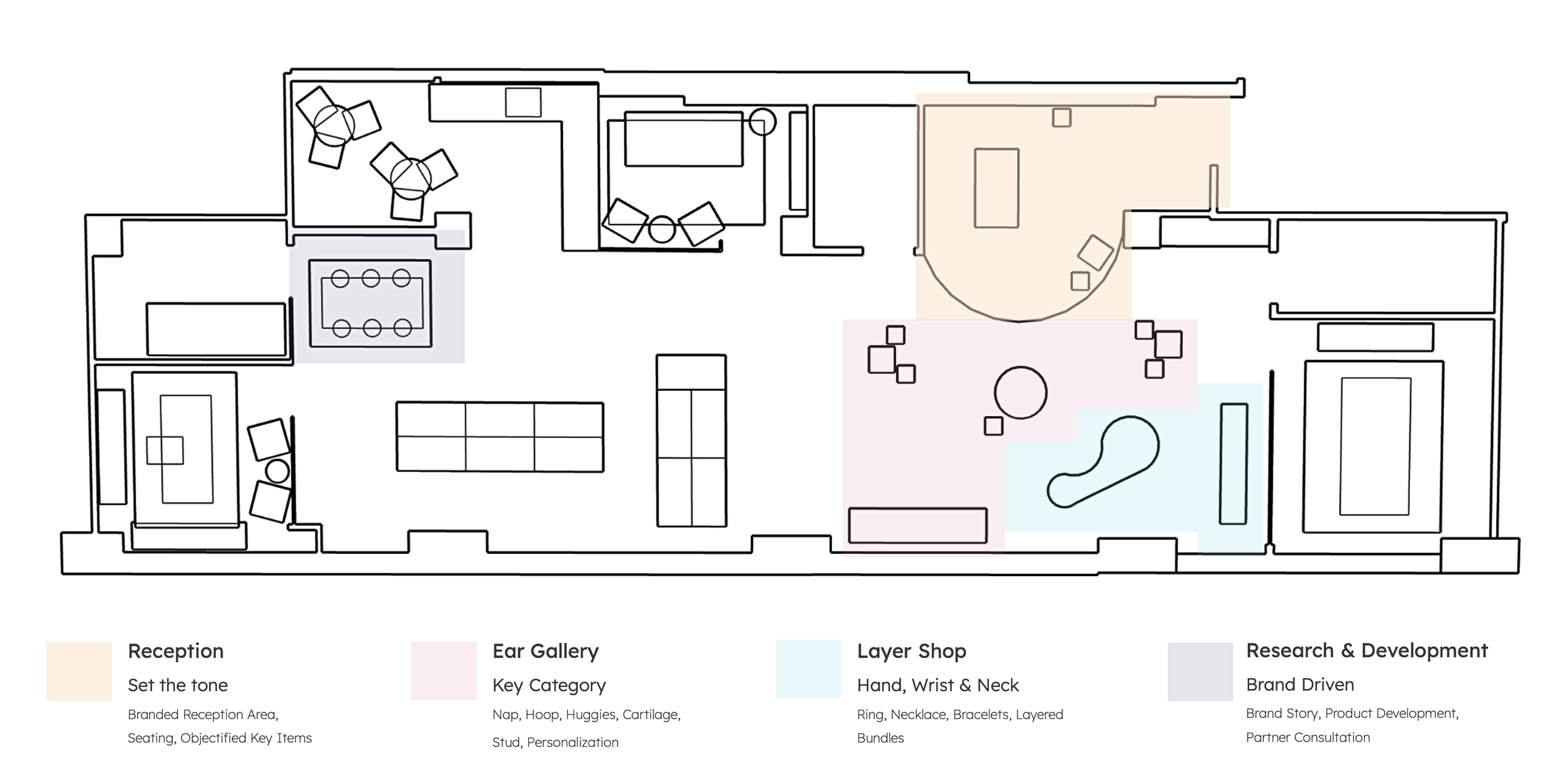 The 2,000 sq ft white box was transformed into defined, multifunctional zones. Careful spatial planning balanced flow and function, while keeping product-focused areas at the center of the experience.